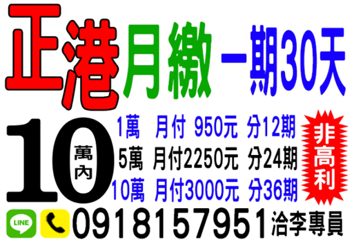 基隆借錢,身份證借款《Yes借錢網》證件借款,正港月繳一期30天,10萬內,1萬月付950元,5萬月付2250元,10萬月付3000元,非高利,當日放款